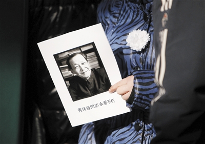 昨日上午9时,八宝山殡仪馆大礼堂,黄纬禄的遗体告别仪式举行,两千人胸前戴着白花、手捧遗像、眼含泪水送别老人。