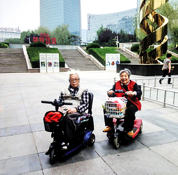 晚年陆启铿夫妇经常一起骑代步车出门。