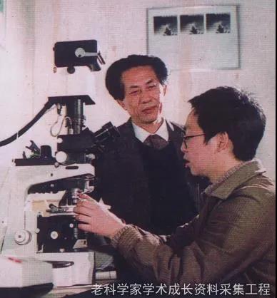 1988年,闵乃本(左一)与王牧在晶体生长实时观察实验室讨论分形生长