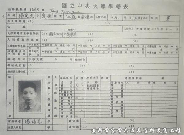 图为汤定元的中央大学学籍卡。入学考试英语为零分,但物理和其他科目成绩较高,被破格录取。