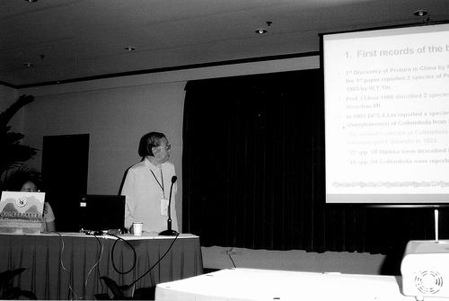 ②尹文英在国际会议上作报告。