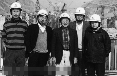 2002年,《三峡三期围堰爆破拆除方案设计与研究》项目验收后,郑哲敏(中)考察三峡船闸工地。