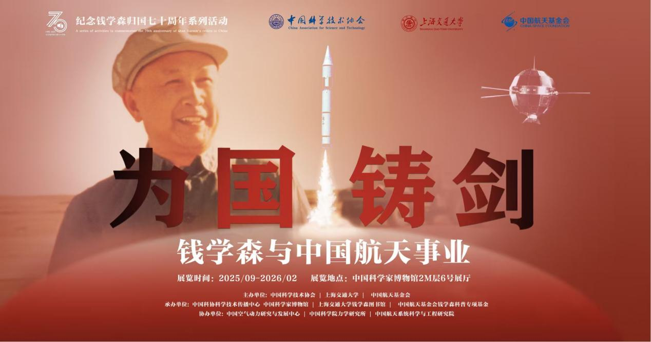 1949年中华人民共和国成立之后,党中央高瞻远瞩、审时度势,做出发展以“两弹一星”为核心的国防尖端科学技术的决策。1955年,钱学森满怀爱国热情,冲破藩篱,毅然归国,投身火箭、导弹、人造地球卫星等尖端技术的研制工作。2025年是钱学森同志归国七十周年。为进一步学习贯彻习近平总书记关于大力弘扬科学家精神的重要指示,讲好钱学森故事,回应公众对高质量科普日益增长的需求,中国科学技术协会、上海交通大学、中国航天基金会共同策划《为国铸剑:钱学森与中国航天事业》专题展览。