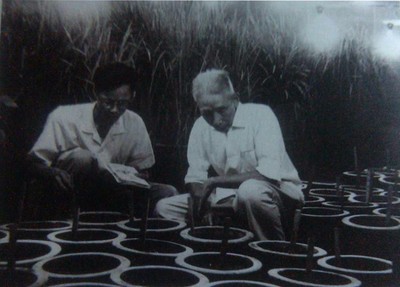 1963年,丁颖(右)在水稻生态室大网室指导吴灼年进行水稻长光实验