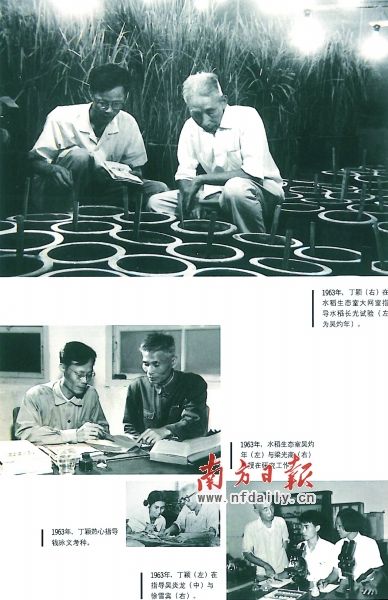 卢永根:那时很多人都被迫虚报粮食产量,两广地区其实平均亩产只有500斤左右,但虚报产量竟然高达1万到10万斤,为了搞假,有些地方把好几亩地收割来的稻子堆成一座小山,拍照为证,自欺欺人。身为农科院院长的丁老其实很难做,那段时期他很痛苦,他不愿意曲意逢迎,违背科学和良心,又受制于 “纪律”和“规定”,只能“不出声”,默默承受、挣扎,内心感受虽然他从不对人提及,但是朝夕相处可以感受得到。
