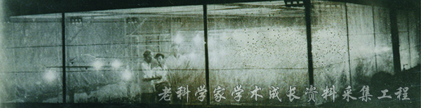 1962年,丁颖夜间到网室观察水稻品种的长光试验情况,左一为丁颖。