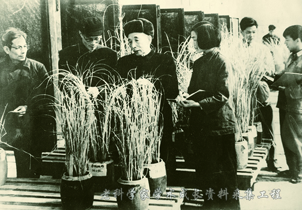 1963年,丁颖在水稻生态室暗房指导水稻品种临界光长试验。