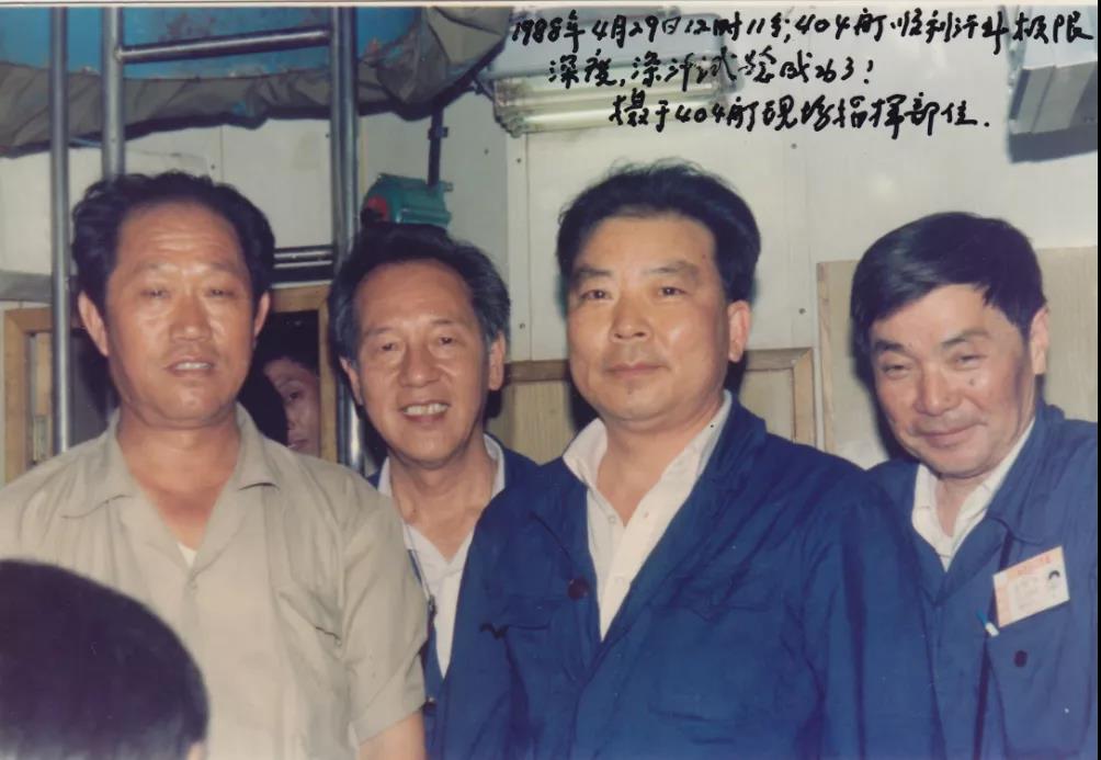 “404”艇深潜试验顺利达到极限深度后,现场指挥部人员露出笑颜(左起依次为:核潜艇总体建造厂副厂长王道桐、黄旭华、北海舰队副参谋长王守仁、总师办主任吴庭国)(1988年4月29日)