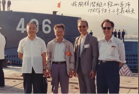 1988年9月15日,我国第一代核潜艇研制工程四位总设计师聚于“406”艇前(左起为:赵仁恺、彭士禄、黄纬禄、黄旭华)