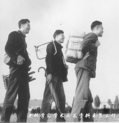 1961年,天文重力教研室重力测量课程小组教师管泽霖、宁津生(中间)、宋鸿德在进行重力测量外业工作。