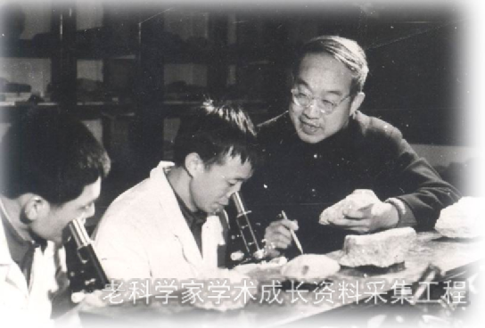 王德滋(右一)在实验室中指导研究生研究岩石薄片