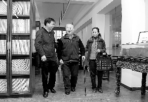 2011年11月10日,在清华大学建筑学院资料室,吴良镛院士(中)在接受媒体联合采访完毕后离开。新华社记者 金立旺 摄