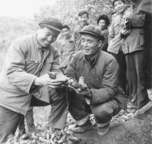 1975年,在宁强县东风三队,徐锦堂与张国栋县长采挖天麻