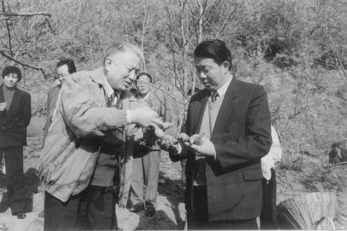 1999年,在略阳九中金乡,徐锦堂和县委徐登奎书记在天麻采挖现场