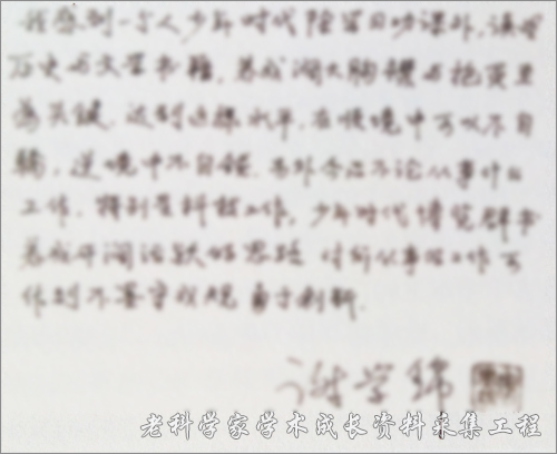 1995年,在为《院士风采》一书的题词中,谢学锦曾经这样写道:“我感到一个人少年时代除学习功课外,读些历史与文学书籍,养成阔大胸襟与抱负至为关键。达到这样水平,在顺境中可以不自骄,逆境中不自馁。另外今后不论从事什么工作,特别是科技工作,少年时代博览群书,养成开阔活跃的思路,对所从事的工作可做到不墨守成规,勇于创新。”