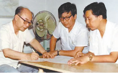 于敏(左一)和同事常铁强(左二)、贺贤土(右一)讨论工作。
