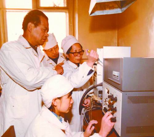 于维汉(左一)在生化实验室指导实验。