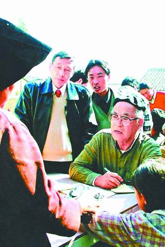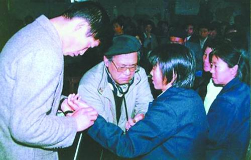 81岁高龄的于维汉(右)再次来到云南楚雄,向当地医生询问克山病病情。