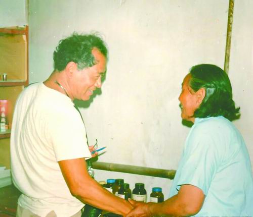于维汉(左)在光荣村向他治疗好的患者介绍预防保健常识。