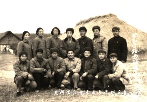 1965年张焕乔在罗山子路劳动修水库,捡石块,自己打茅草坪,吃的好留影(第一排:左一吴庆德、左二张文庄、左三张焕乔、左四董大年、左五景烈、左六李吉增、左七张玄武;第二排:左一贾桂华、左二刘龚瑜、左三朱明惠、左四崔吉顺、左五杜光庭、左六叶春堂、左七李学伟)