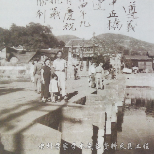 竺可桢家人到街头参加抗战胜利庆祝活动时留影,竺可桢1945年9月5日摄于遵义中正桥边。 左起:陈汲、竺松、竺津。