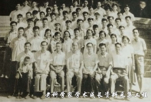 金属物理教研组全体教师与首届(金物61届) 毕业生合影(前排左二为张兴钤、左四为柯俊、左五为肖纪美、右一为方正知,1962年初)