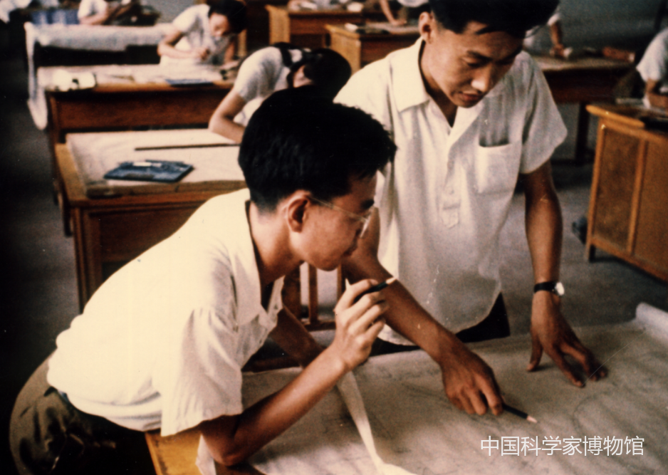 王永志(右)与技术人员研究改进东风二号设计方案