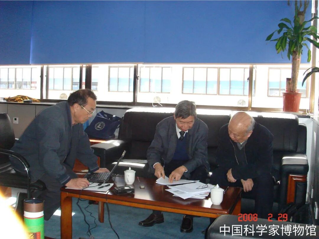 2008年,陈俊武(中)与《石油替代综论》合著者李春年、陈香生讨论书稿
