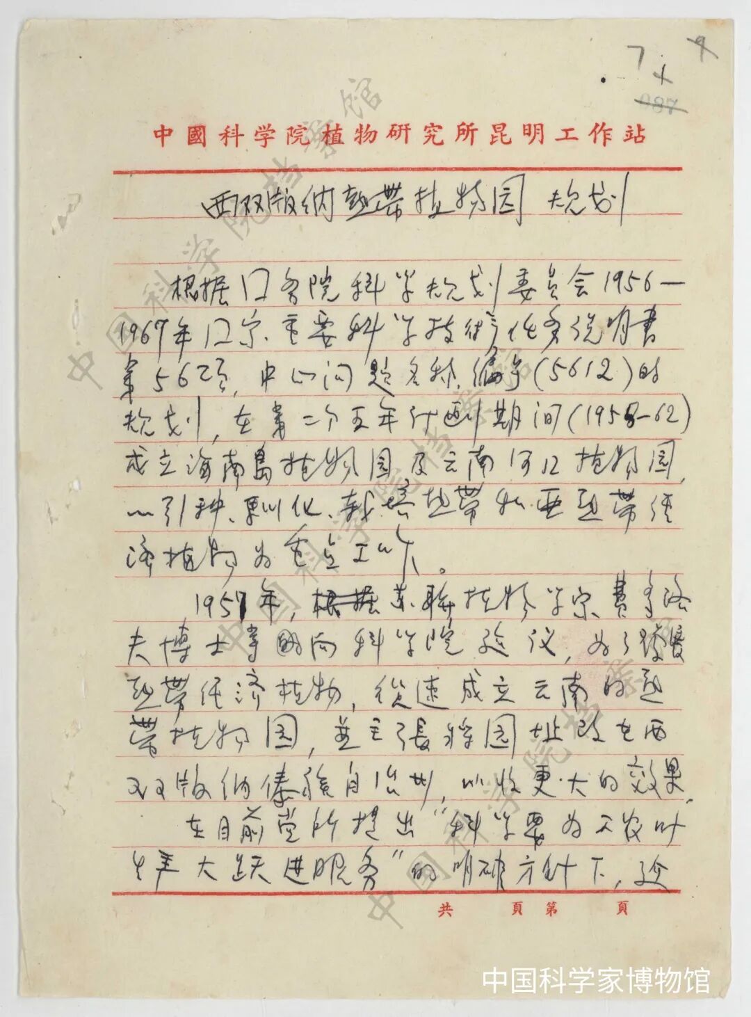 蔡希陶的手稿《西双版纳热带植物园规划》