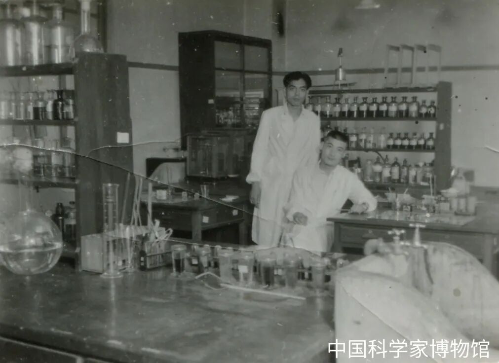 程之范(坐)与同学摄于北京医学院实验室