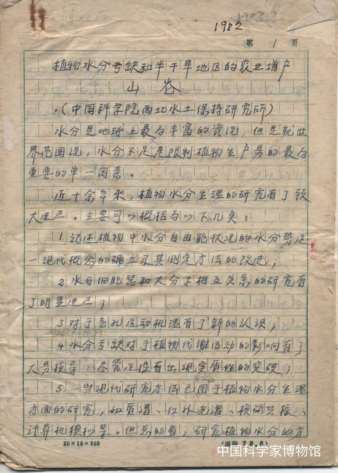 山仑所写的植物水分亏缺和半干旱地区的农业增产手稿